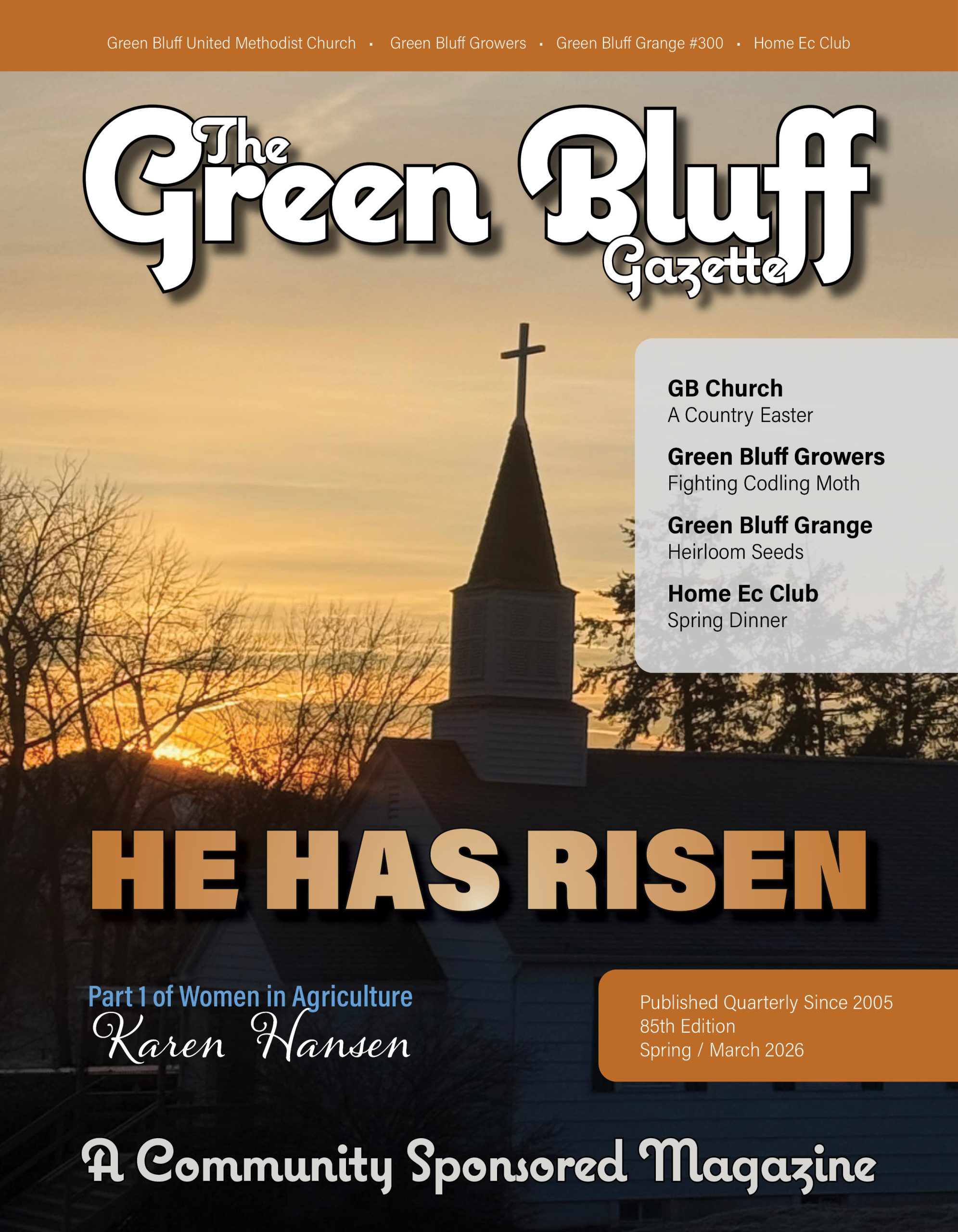 Who can tell this year! We are proud to present the 85th edition of the beautiful Green Bluff Gazette magazine. Enjoy hearing about what your neighbors are doing, and mark your calendar for some fun community events we can all enjoy together. We are forever thankful to our wonderful contributors, and invite anyone to reach out to us any time if you would like to work on an item as well.